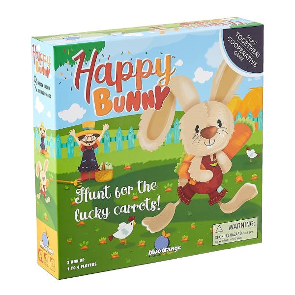 Contents: 1 playing field, 40 carrots, 1 wooden farmer figure, 1 wooden happy bunny figure, 1 bunny house, 1 colored die